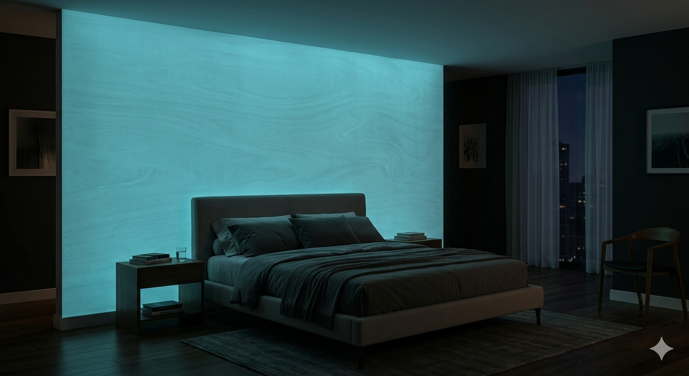 A soft glow on the accent wall behind the bed creates a romantic and relaxing atmosphere, completely replacing the need for a nightstand lamp.
